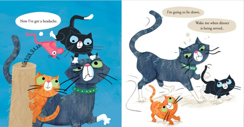 Kevin’s back! It was loads of fun illustrating this one; the dog came back and then there were two cheeky kittens to draw. I decided on a marmalade kitten, and an extra-naughty black-and-white one (all black-and-white kittens I’ve ever met have been naughty).