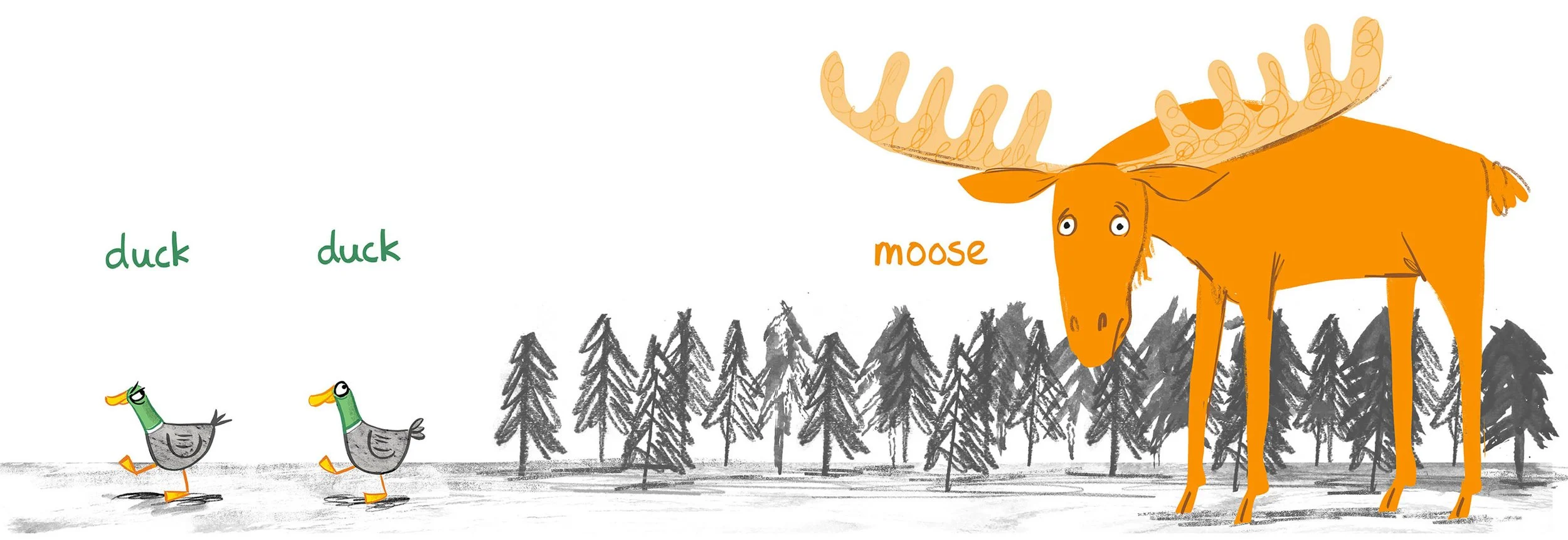 I developed Duck Duck Moose to introduce very young readers to the experience of reading independently. So, the body language of the characters carries the storyline, encouraging expression and re-reading. In the background, the sparse, landscape layout builds anticipation and helps teach reading left to right.