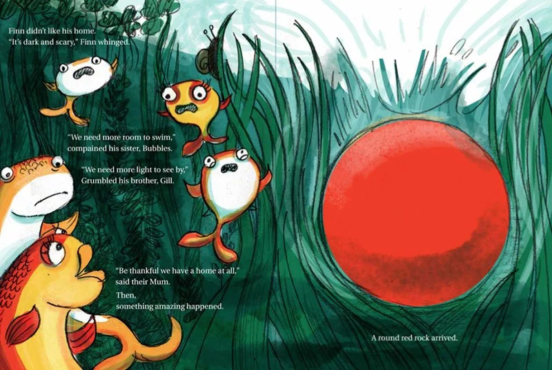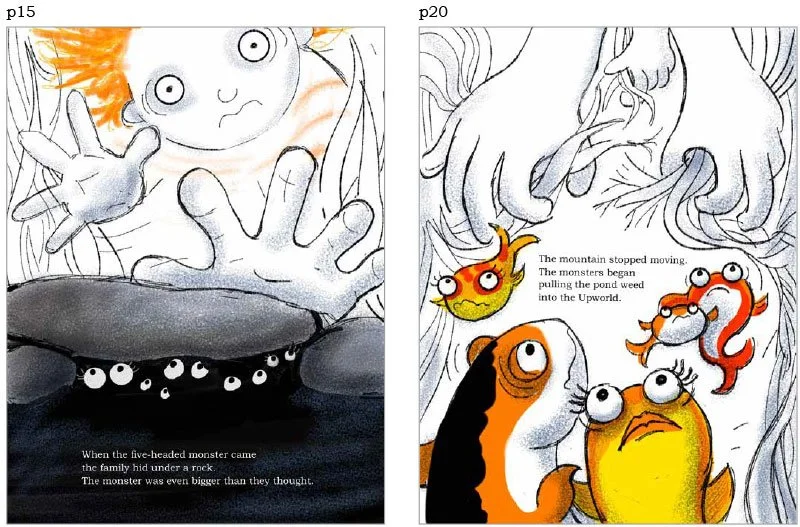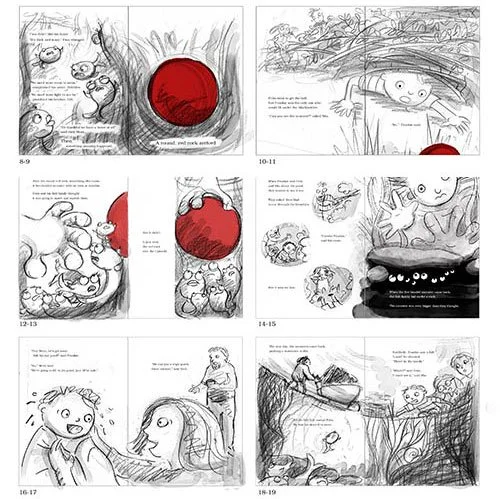 Covers were tricky, especially as the name of the book changed, at the eleventh hour, from ‘The Round Red Rock and the Five-Headed Monster” to “Frankie and Finn”. Here are some cover designs: those pitched by me (thought to be too scary) and the super-professional early and final designs by the talented Ingrid Kwong.