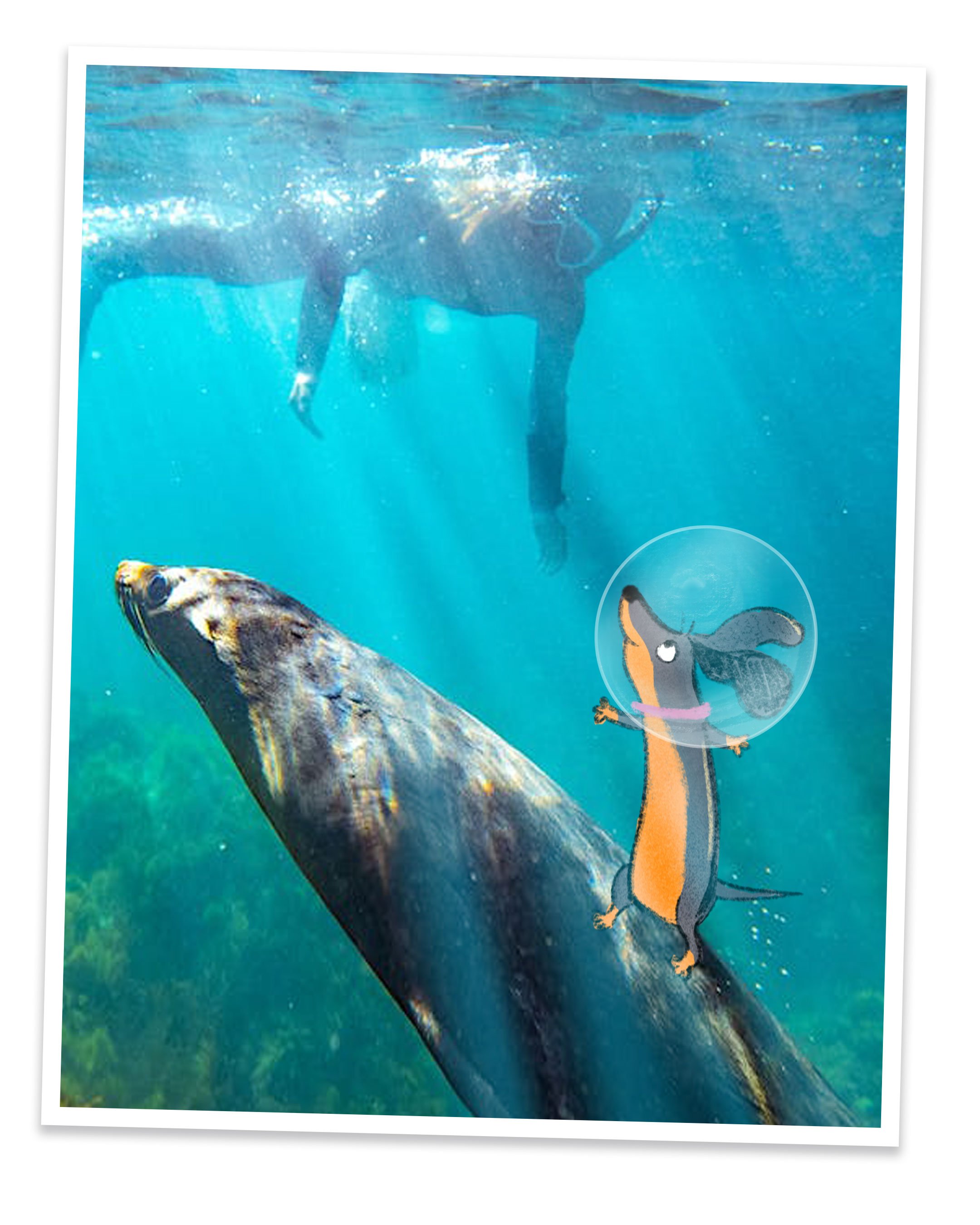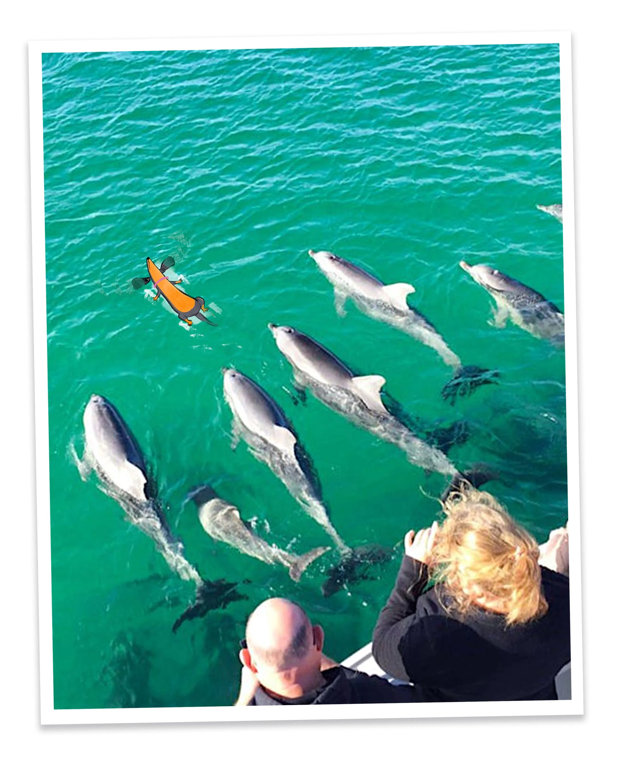 This is Valerie swimming with dolphins with Kangaroo Island Ocean Safaris. Swimming with dolphins is a good opportunity for a dachshund to practice backstroke.