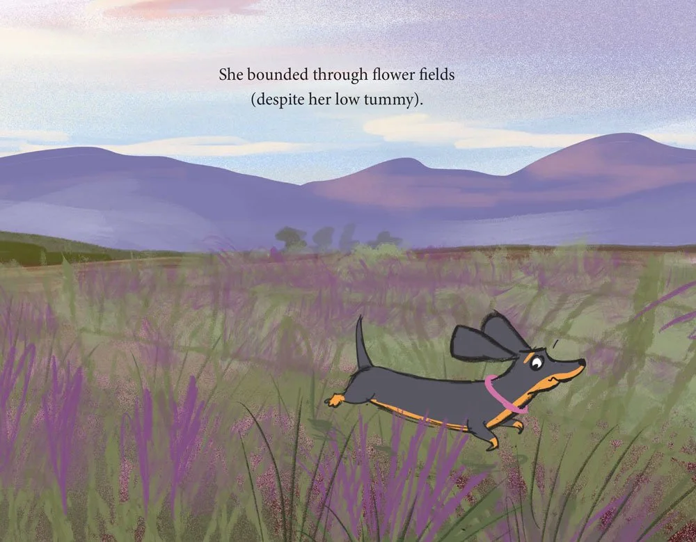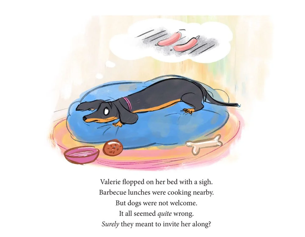 Here are some of my development sketches and story building process sketches for Valerie (later on I changed her ears, which were a bit long – even for a dachshund!):